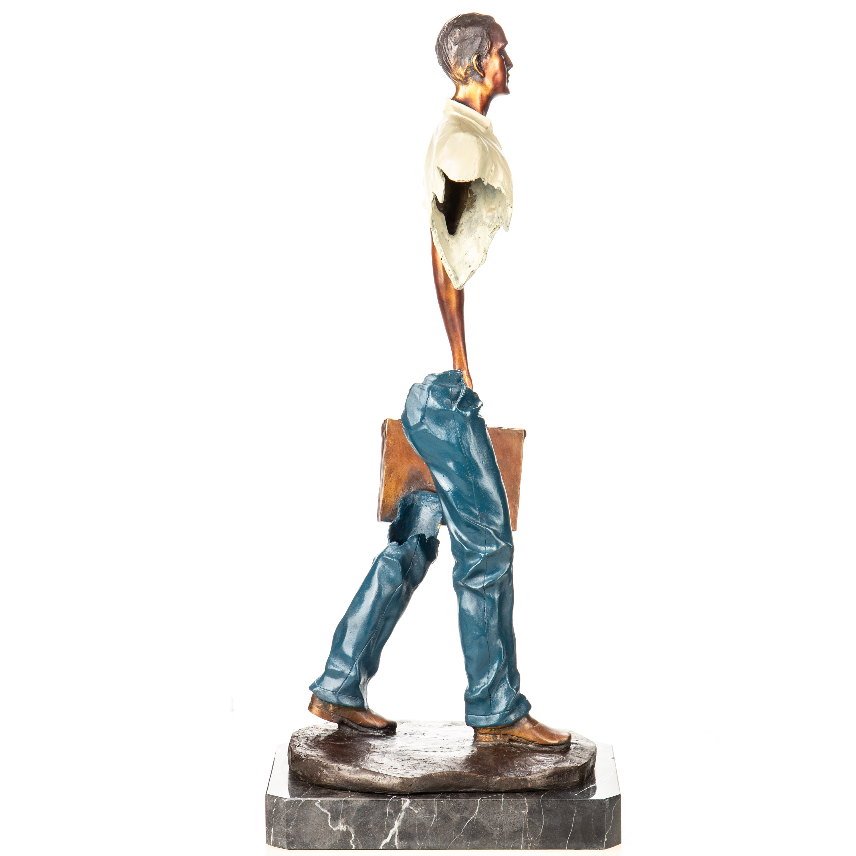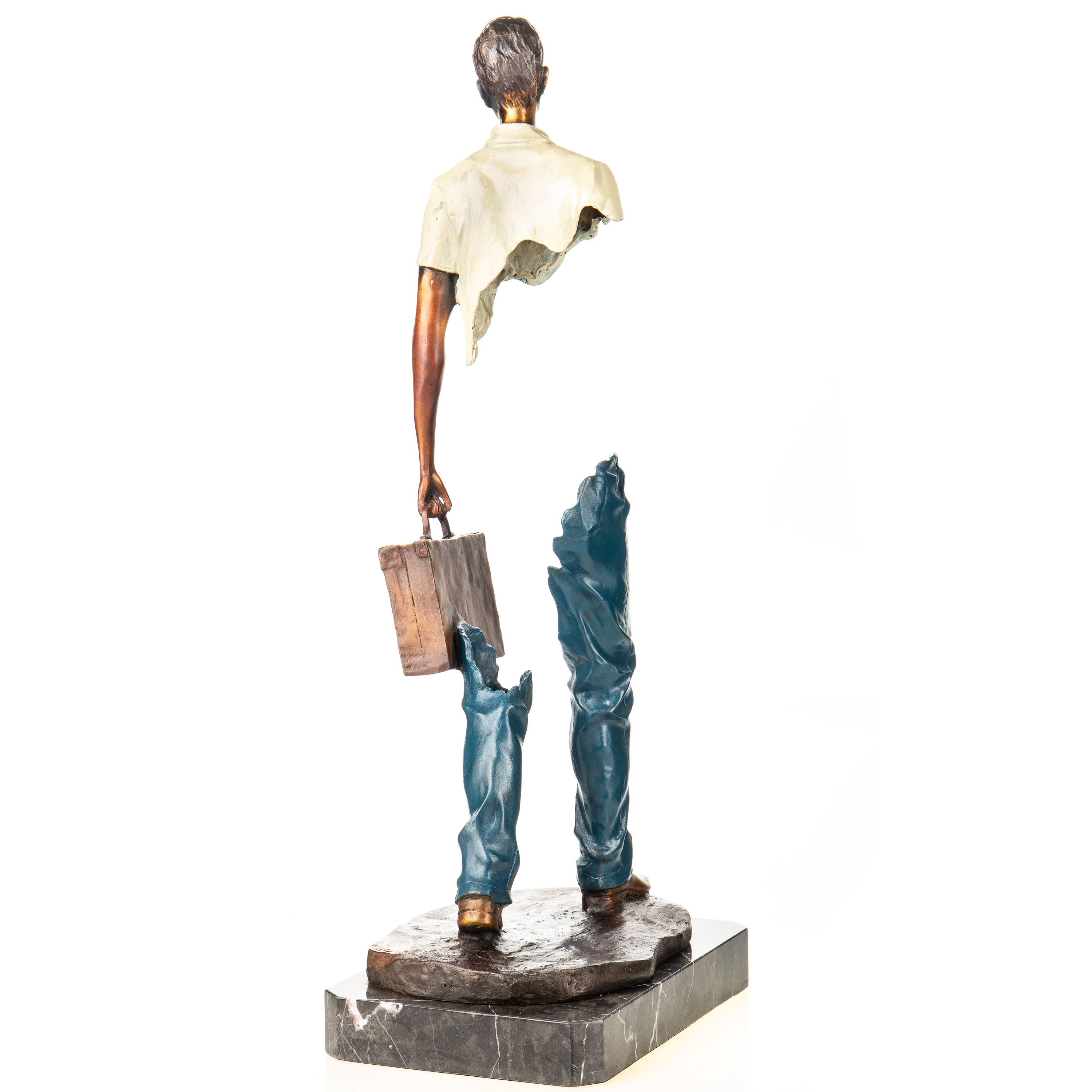 Farbige Bronzefigur Mann mit Koffer Modern